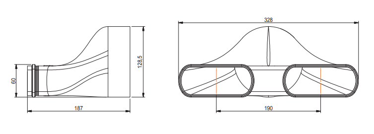 Het Easyflex Renson recht dubbel verloopstuk is onderdeel van het EasyFlex luchtkanaalsysteem van Renson. De Design extractieroosters van Renson of een ander ventiel geschikt voor een binnendiameter 125 mm kunnen direct in de ventielaansluiting geplaatst worden. De dubbele aansluiting maakt dat u 2 kanalen (ovaal) kunt bevestigen aan 1 ventiel. Wanneer u gebruik wilt maken van ruimtes die een hooge extractiedebiet vereisen. De dubbele ventielaansluiting wordt ook gebruikt als overgang van een ronde aansluiting 125mm naar een ovale aansluiting 140 x 64mm.