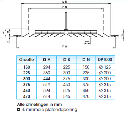 Dit vierkant plafondrooster is geschikt voor de toevoer en afvoer van gekoelde en verwarmde lucht. Het rooster heeft een vast horizontaal uitblaaspatroon in 4 richtingen met een uitneembaar binnenwerk dat standaard is voorzien van een veiligheidskoort. Montage doormiddel van een onzichtbare centrale schroef (meegeleverd). De centrale schroefbevestiging bevindt zich aan de achterzijde van het centraal binnenwerk. Uitgevoerd in volledig geëxtrudeerd aluminium in de kleur wit (RAL9016). Gatmaat is 525x525mm (B), N=450x450mm en A=594x594mm. Dit rooster past ook in een systeemplafond.